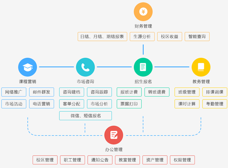 核市场工作。为管理者提供线索转化率分析,学员学时分析,续费续报分析等关键报表,